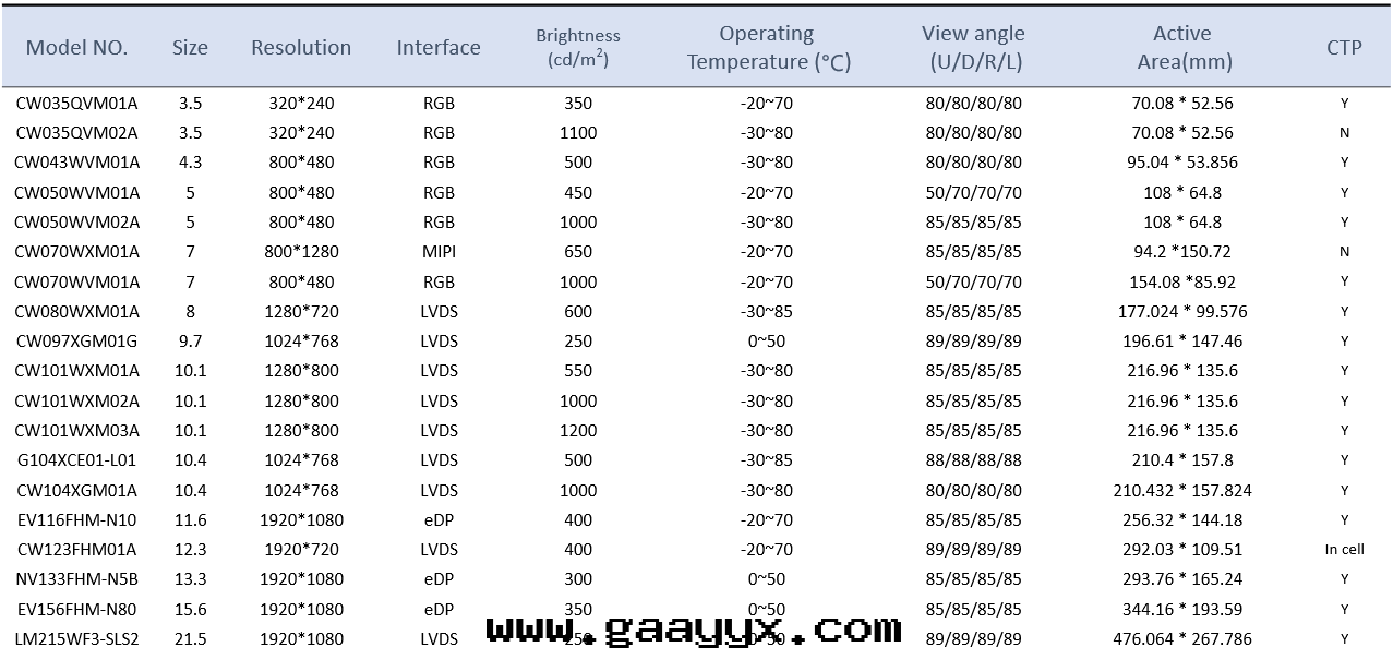同(tóng)时(shí),考慮客户的(de)定(dìng)制化(huà)需求,芯沃科也(yě)針(zhēn)对(duì)不(bù)同(tóng)市(shì)场(chǎng)在(zài)原裝(zhuāng)屏的(de)規格外(wài),开发了(le)一(yī)系(xì)列标(biāo)準規格,滿足客户不(bù)同(tóng)的(de)需求。詳细(xì)規格參考列表(biǎo)。
