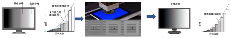 不(bù)同(tóng)的(de)應(yìng)用(yòng)场(chǎng)景有不(bù)同(tóng)的(de)标(biāo)準,但是(shì)都需要(yào)对(duì)顯示器進(jìn)行Gamma校(xiào)準。校(xiào)準的(de)基本(běn)原理(lǐ):單體(tǐ)顯示器在(zài)未校(xiào)準前(qián),如(rú)果(guǒ)用(yòng)專用(yòng)的(de)色(sè)坐标(biāo)測試儀器(一(yī)般是(shì)CA310)測試在(zài)不(bù)同(tóng)灰階(jiē)的(de)色(sè)坐标(biāo),單體(tǐ)上(shàng)都会(huì)在(zài)一(yī)定(dìng)的(de)誤差範圍內(nèi)波(bō)動(dòng)。通(tòng)过(guò)外(wài)置的(de)AD Board,将每个(gè)灰階(jiē)波(bō)動(dòng)的(de)色(sè)坐标(biāo)拉回(huí)到(dào)标(biāo)準曲(qū)線(xiàn)上(shàng),滿足DICOM曲(qū)線(xiàn)的(de)要(yào)求。
