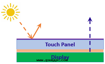 液晶顯示屏容易受到(dào)陽光(guāng)直(zhí)射或(huò)高(gāo)亮(liàng)度(dù)應(yìng)用(yòng)的(de)眩光(guāng)和(hé)反(fǎn)射。框貼是(shì)傳統的(de)貼合技術(shù),在(zài)顯示屏和(hé)觸摸屏或(huò)蓋闆之(zhī)間(jiān)存在(zài)空(kōng)气(qì)間(jiān)隙,空(kōng)气(qì)間(jiān)隙会(huì)導致(zhì)顯示屏在(zài)高(gāo)亮(liàng)度(dù)环(huán)境下(xià)重(zhòng)複折射,会(huì)降低(dī)顯示屏的(de)对(duì)比度(dù)和(hé)可(kě)读(dú)性(xìng)。为(wèi)了(le)減少(shǎo)这(zhè)些(xiē)元(yuán)件(jiàn)內(nèi)部(bù)的(de)折射,光(guāng)學(xué)貼合解(jiě)决了(le)各(gè)部(bù)件(jiàn)之(zhī)間(jiān)的(de)气(qì)隙问題(tí)。光(guāng)學(xué)光(guāng)學(xué)层可(kě)以(yǐ)使折射最(zuì)小化(huà),從而(ér)使屏幕在(zài)室(shì)外(wài)或(huò)高(gāo)亮(liàng)度(dù)条(tiáo)件(jiàn)下(xià)更(gèng)容易观看(kàn),而(ér)無需增加屏幕本(běn)身(shēn)的(de)亮(liàng)度(dù),從而(ér)獲得更(gèng)好(hǎo)的(de)图(tú)像質(zhì)量(liàng)。光(guāng)學(xué)貼合減少(shǎo)了(le)反(fǎn)射的(de)环(huán)境光(guāng)量(liàng)(即增加对(duì)比度(dù)),結合蓋闆上防眩(AG)和(hé)增透(AR)處(chù)理(lǐ)從而(ér)提(tí)高(gāo)了(le)陽光(guāng)的(de)可(kě)读(dú)性(xìng)。